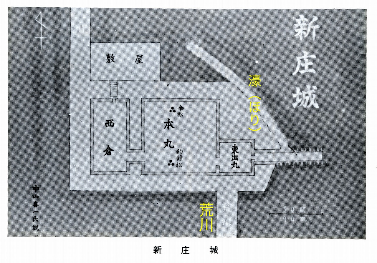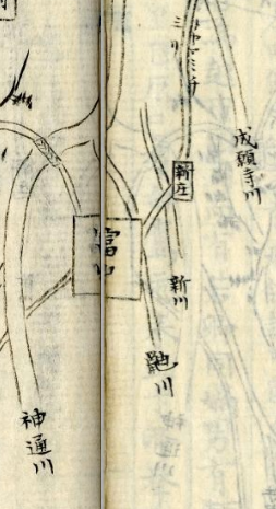 荒川を「新川」と記した、貴重な絵図。元は新川神社の傍を流れるので川筋を「新川」または「新庄川」と呼んだが、数々の洪水を以て田畑を荒らすので「荒川」と名付けたという。