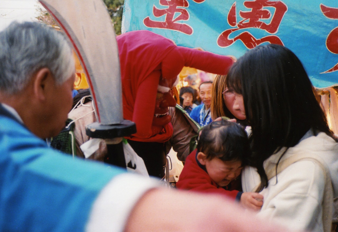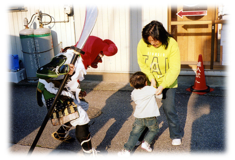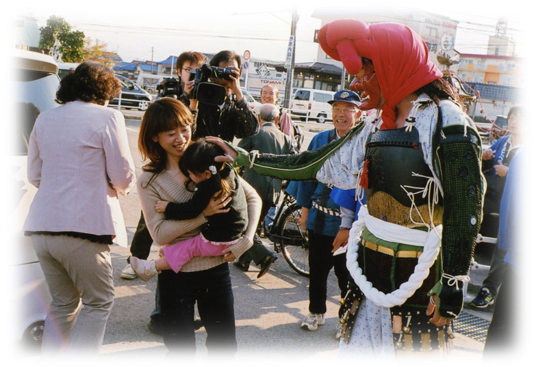 その姿は武士の甲冑にわらじをはき、怖面の赤色の面を付け、大頭巾で長髪を結わえた姿で大長刀を振り回して露払いをおこなう姿を一目見るため近郷近在より大勢の人が訪れます。なかでも子どもたちはどべに追われて逃げ、捕まえられてその恐ろしさからワッと泣き出す場面もあり、たいそう賑やかなお祭であります。昔からどべに頭を撫でられるとできものが出来ないといわれ、嫌がる子供をどべに差し出す母親の姿もみられ、県内でも奇祭として知られています。