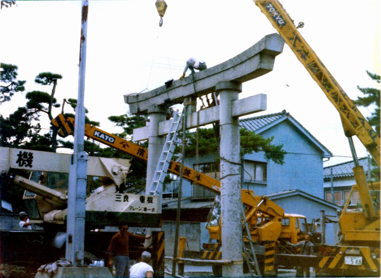 と誓を立て祈願いたしましたら不思議にも水はたちまち減退していったので一同歓喜いたしました。そして誓いを立てたとおりに、翌年の元和二年には附近の住民(新庄・広田・嶋・針原)達は力を併せて新庄城外の高台である現在地に遷座されたのであります。この地はその当時はずいぶん高台であったようですが