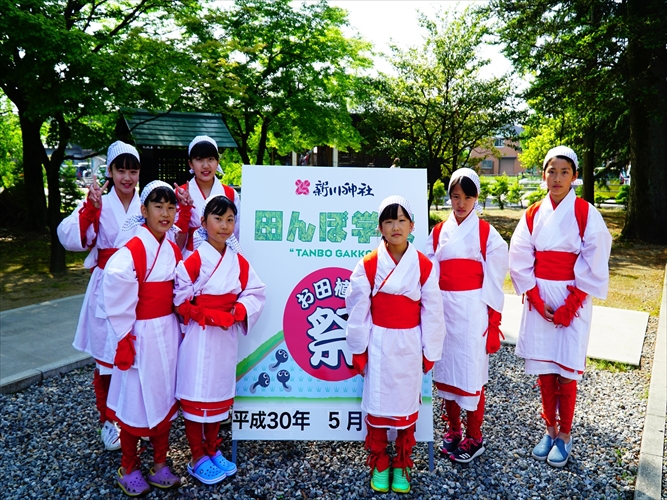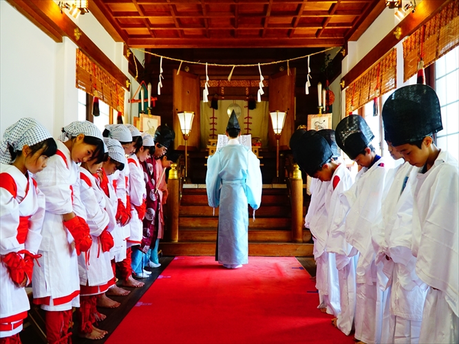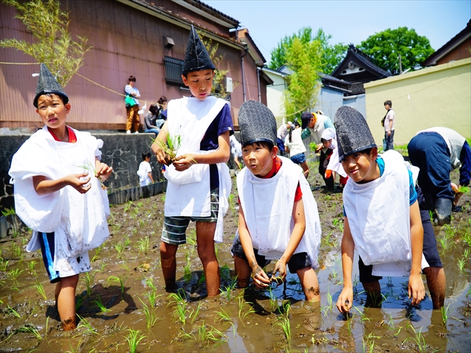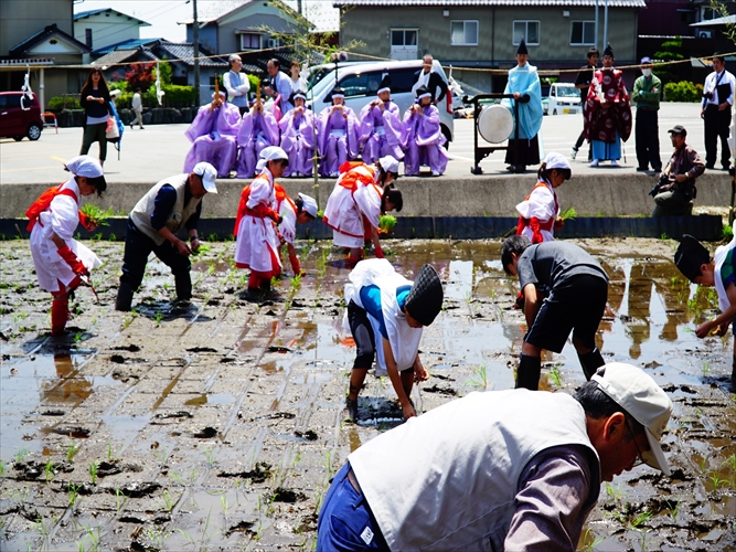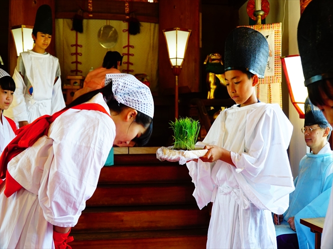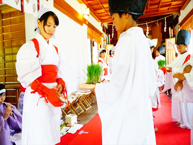 5月の御田植祭では、地域の学童より田男・早乙女を募り、豊作を祈る御田植祭での献饌(けんせん)を行ってもらいます。