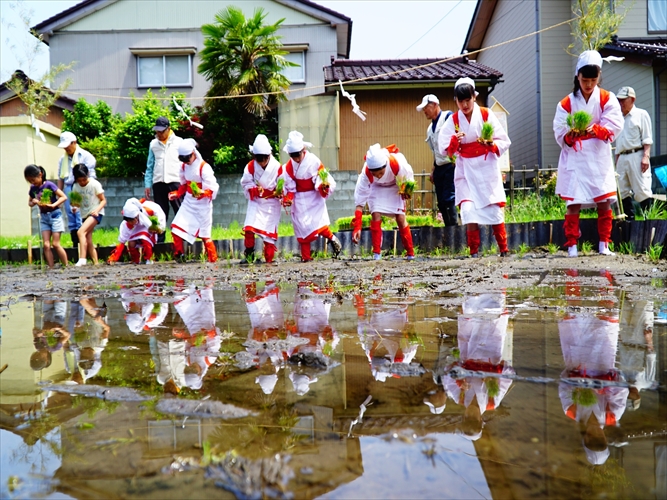御神田への参進を行った後、実際に自分たちの手で苗を植えていきます。