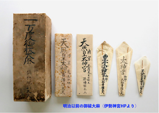 明治になって、御師による配布は廃止され、御祓大麻は神宮大麻(じんぐうたいま)と名称が改まり、明治天皇の聖旨により政府事業として全国全戸に漏れなく配布される様になりました。