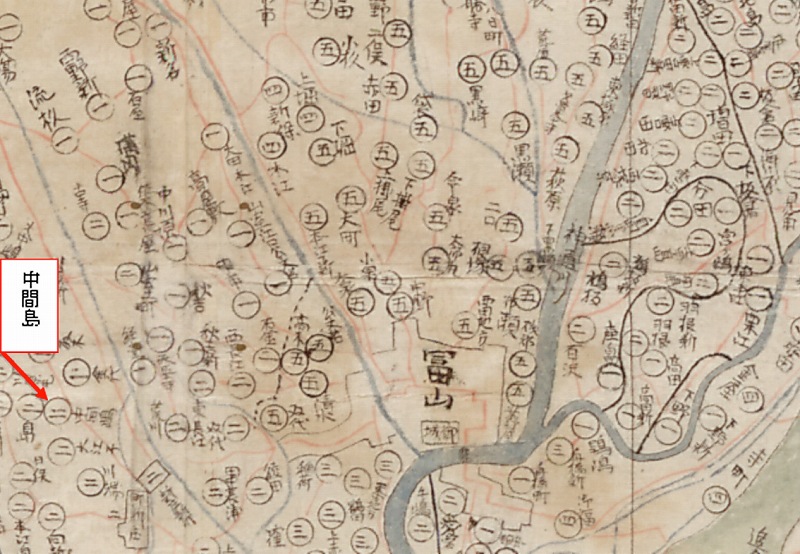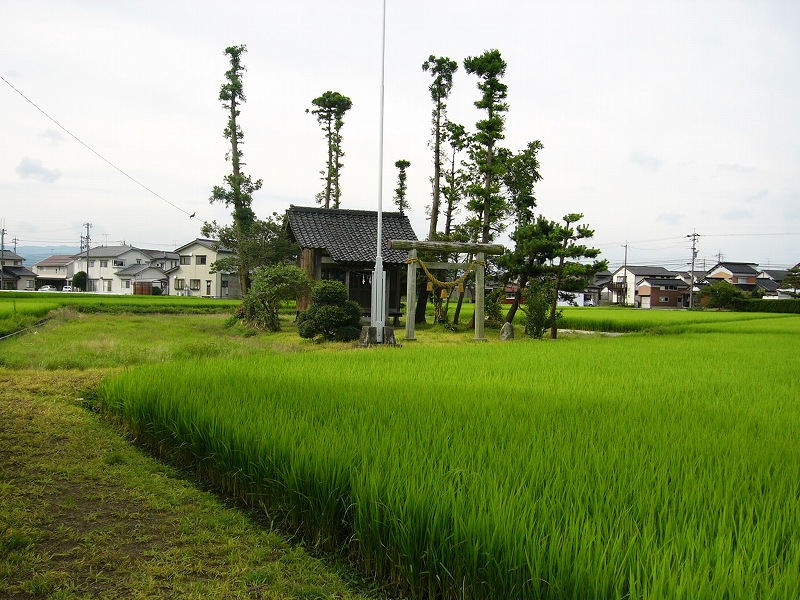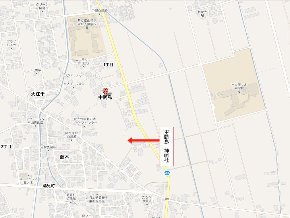 由緒不詳。中間島村は常願寺川の中流左岸に沿って開けた土地で、現在の藤ノ木地域にある部落は江戸中期から後期にかけて開発されたものが少なくない。しかし、江戸初期に作成された「越中四群絵図」を見るとすでに朝日村、藤ノ木村、貫田村、日俣村とならんで中間島村も描かれている。江戸時代の初期には戦国期以来の在地土豪層あるいはその系譜をひく本百姓層が用水の開設や新田開発を行い、既に活況を呈していた。