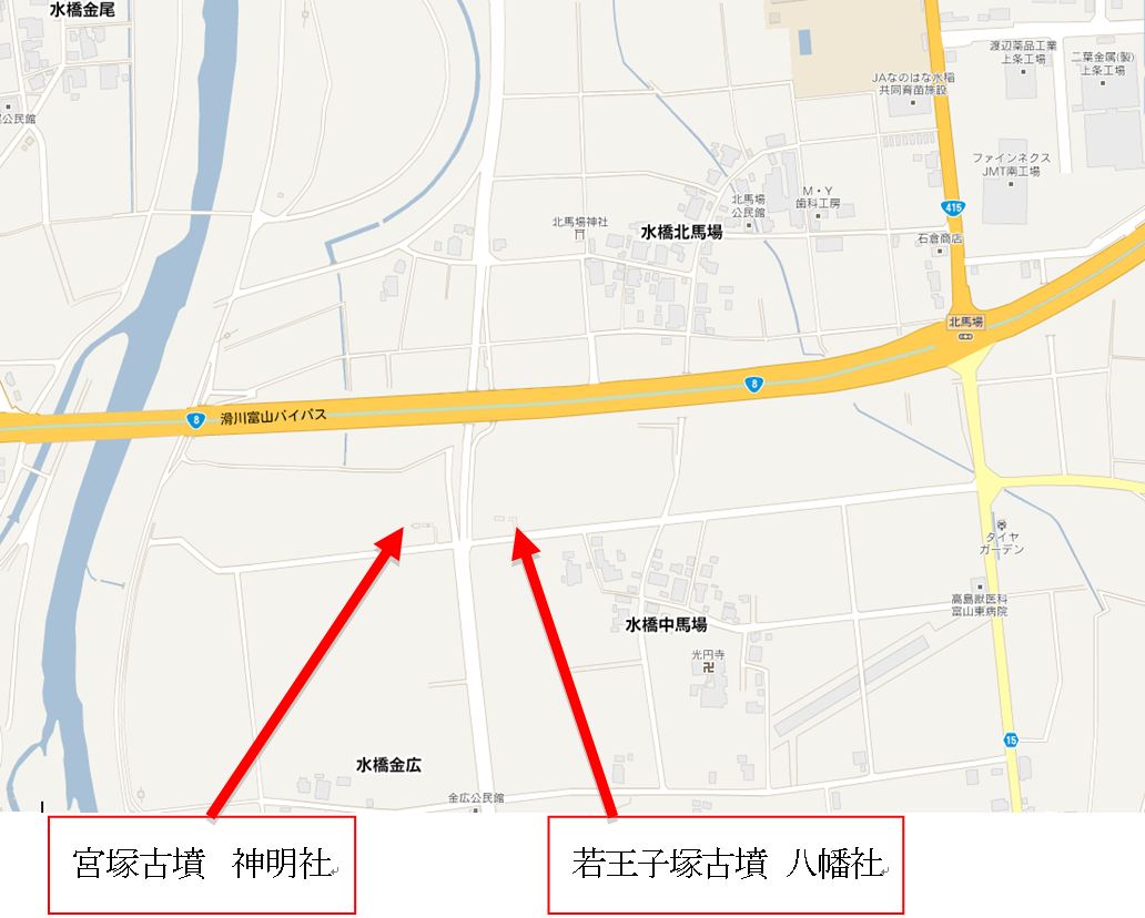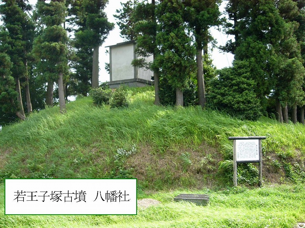 中馬場の宮塚古墳と若王子塚古墳は数10メートルを隔てて東西に並んで築かれている。宮塚古墳は現在古墳の頂部を削って神明社が建てられているが、一辺が約20メートル、高さ2メートル余りの方墳であったと考えられる。一方、若王子塚古墳も東側を大きく削り取って社殿が建てられているが、こちらは直径17~18メートル、高さ6~7メートルの高く盛り上がった方墳である。これらの古墳群はおそらく5~6世紀ごろに築かれた物であろう。