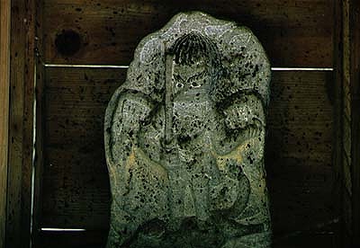 西猪谷から神峡橋を渡ると、正面に素盞鳴社(すさのをしゃ)があります。その境内のうしろに小さな祠があり、その中に祀ってあります。その姿は、浮彫後光背型で、右手に剣を立てて持ち、左手に索をとっています。背には長大な双翼が彫られ、火焔光を負って疾駆する白狐の背中に直立しています。顔は鼻と口が突きでて鳥天狗面に造られていて、秋葉様とも秋葉大権現とも呼ばれ親しまれています。