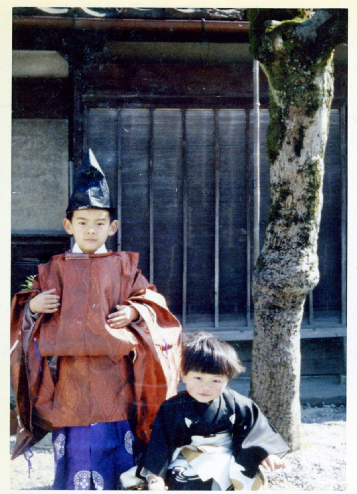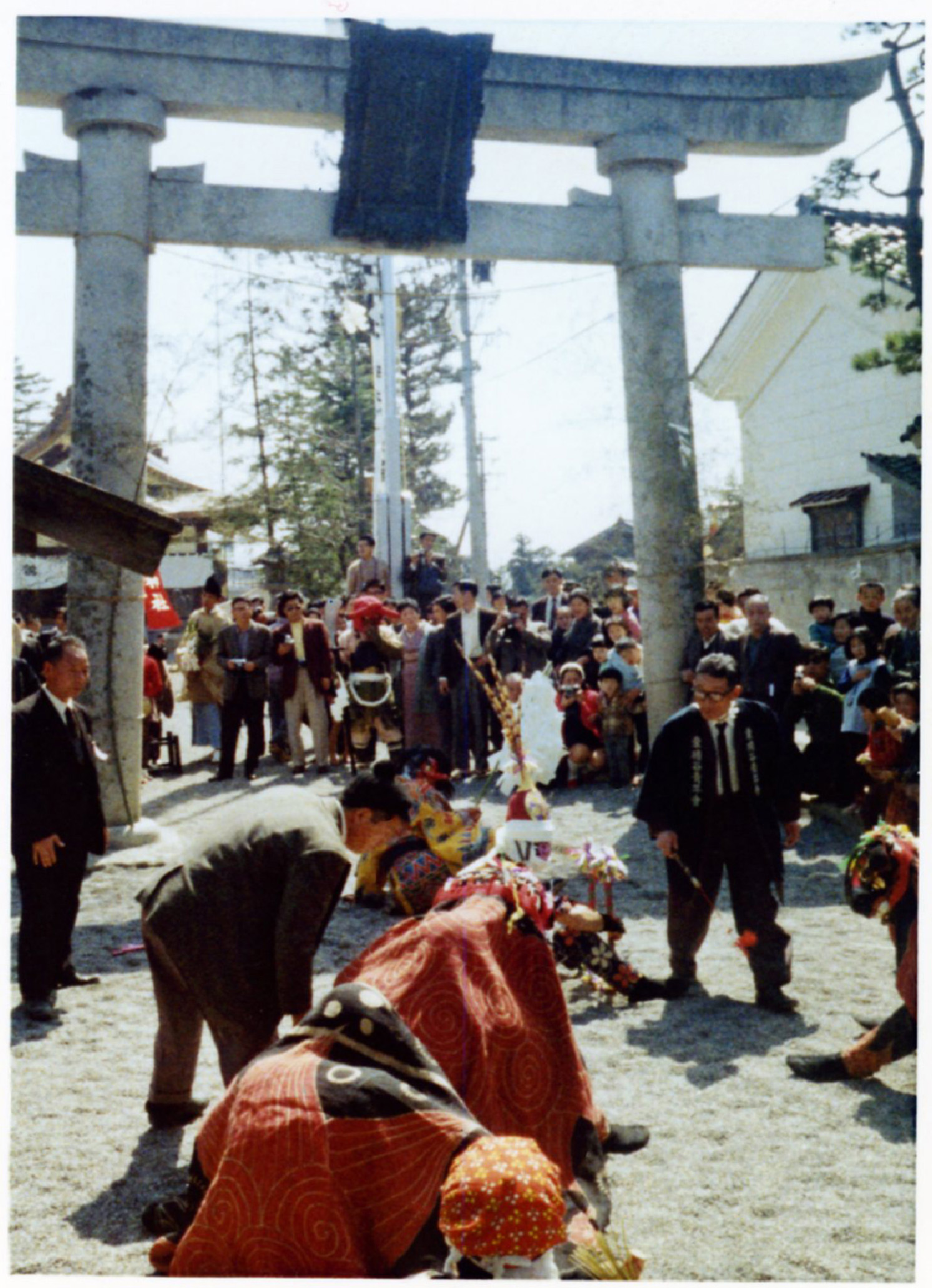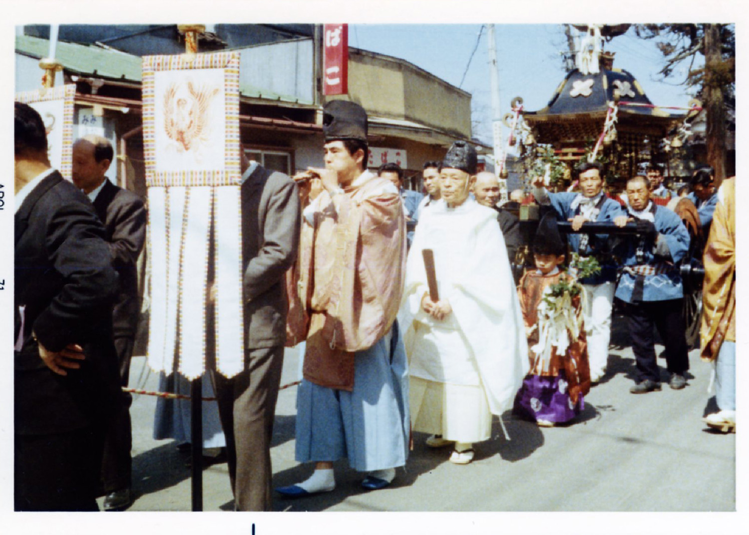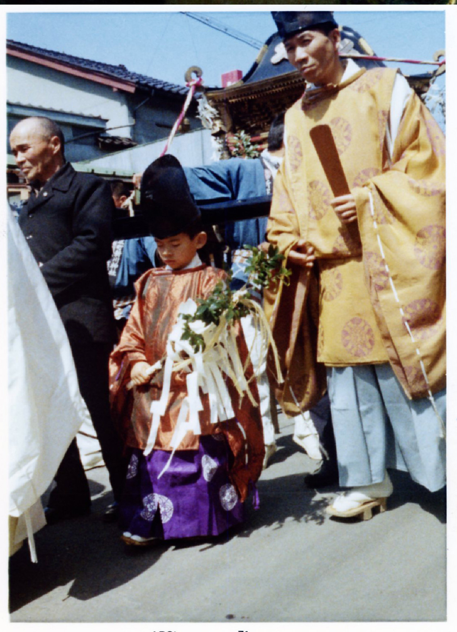 竣功慶賀祭には神輿渡御祭と大沢野猪谷から稚児行列・獅子舞が奉納されました。現在の舩木信孝宮司が齢6歳にして狩衣を着てお供しています。