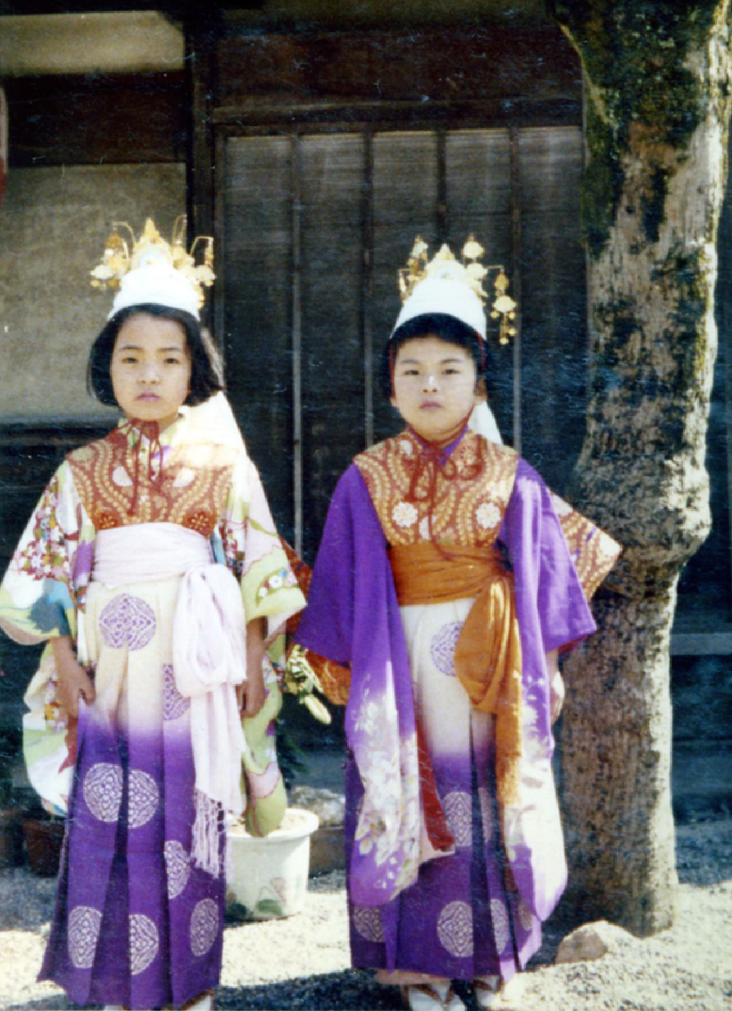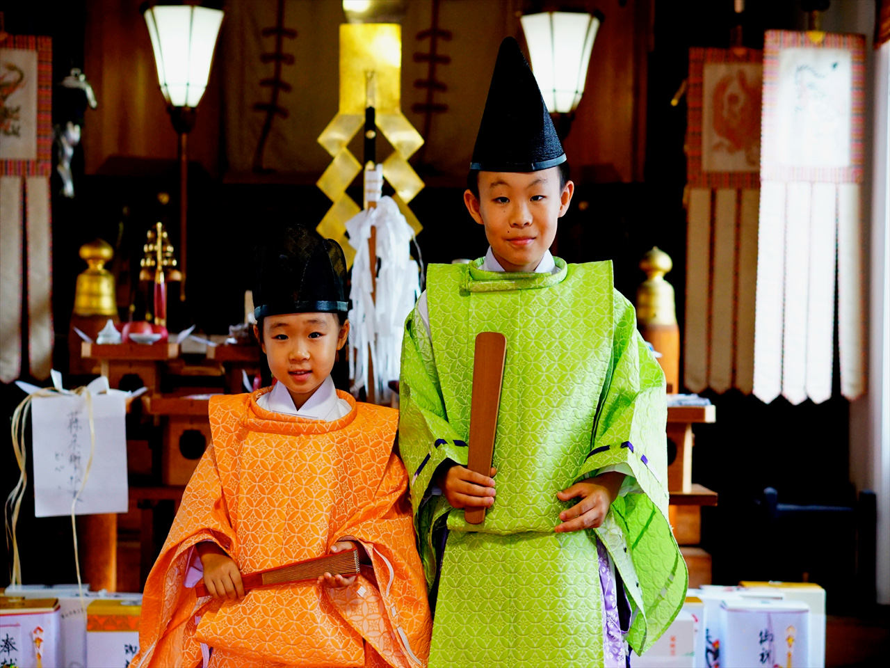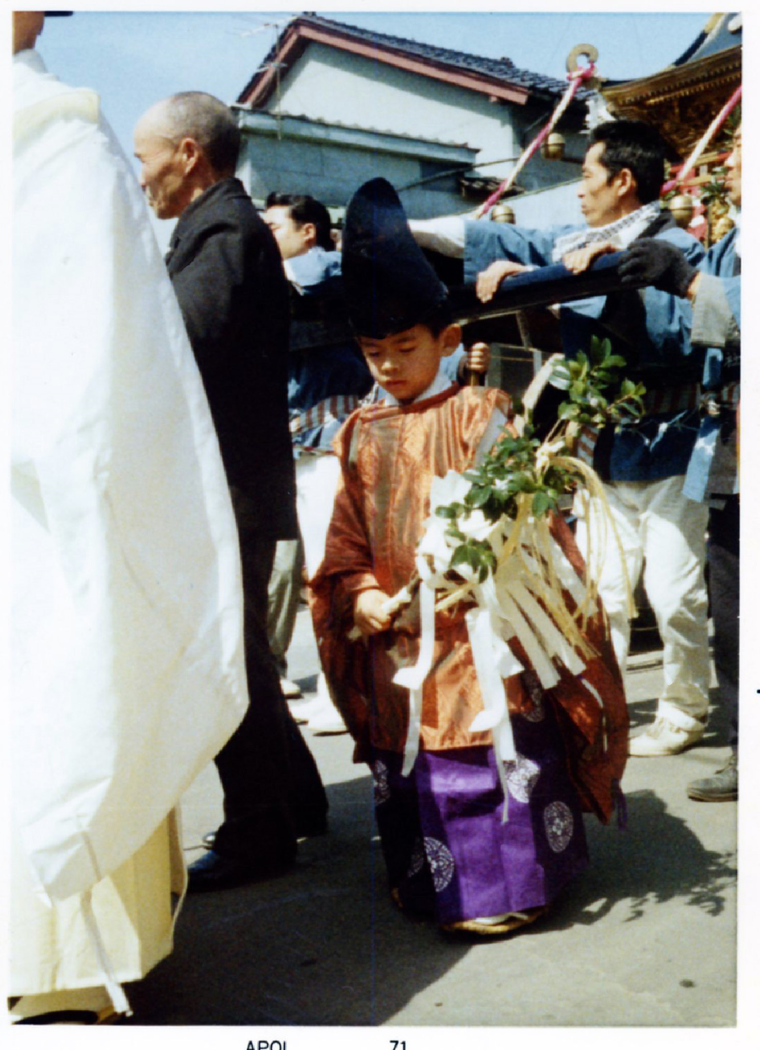 宮司の両脇に右大臣左大臣の随神(ずいじん)児童2名がいますが、いまとはちがい、そのとうじは白粉でお化粧(けしょう)されているのがわかりますね。