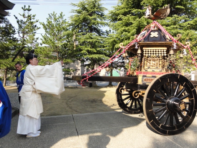 御分霊(ごぶんれい)といいますが、これをうつした神さまの霊である御神霊(ごしんれい)が入った御霊代(みたましろ)を宮司がおみこしにおうつししたならいざ出発(しゅっぱつ)です。