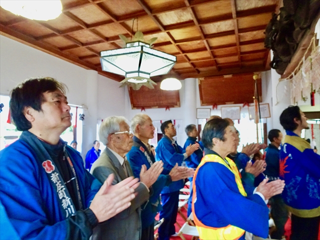 今からわたしたちが神さまにおみこしにおのりいただいて新庄町じゅうおともするのでどうかみんながすんでいる新庄町からわるい霊(れい)やわざわいをおこす悪い神からおまもりください、とおいのりいたします。