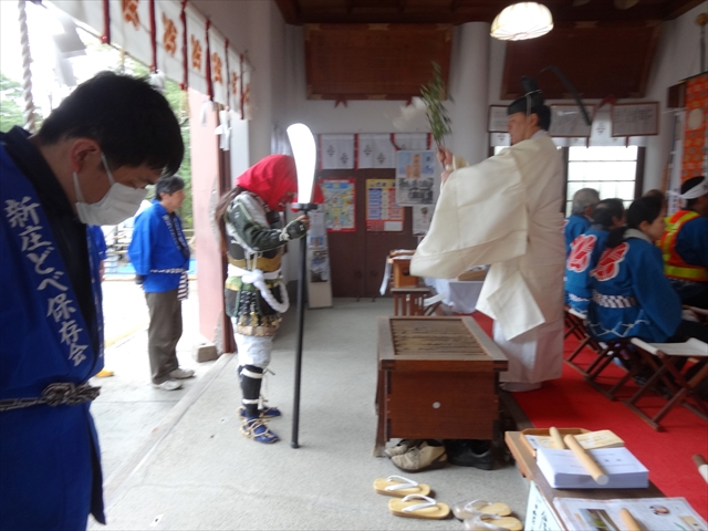 どべが神さまの道案内をしながら御神輿は新庄町のひとたち、会社など約300件のお祈りをお受けになり、神職が祝詞をよんで、住んでいる人たちの健康と安全、会社の発展(はってん)をおいのりしながら新庄町をまわります。