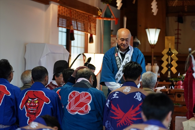新庄町にすんでいるひとびとのだいひょうである総代会(そうだいかい)会長が祭詞(さいし:かみさまへのおねがいごと)をのべてちいきのあんぜん、むじことむさいがいをおねがいして、