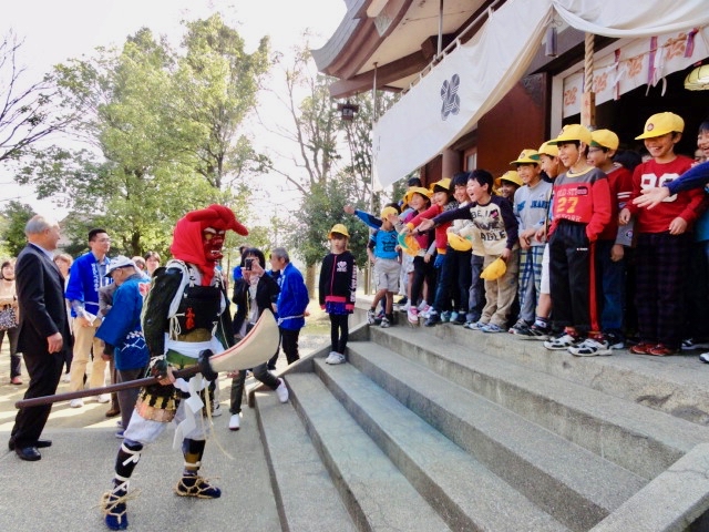 この日、おみこしに神さまがおのりになって町中をまわれるのですが、そのみちあんないを「どべ」という猿田毘古神(さるたひこのかみ)がいたします。むかしのこどもたちは、「どべー、どべー」とはやしたてて「どべ」をおこらせて、にげまわる、というあそびをしました。