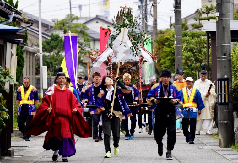 あわせて神さまにはおみこしにおうつりいただいて新庄町の町中をまわることにより、街中をきれいにすべくはらいきよめ、わるい霊・わるい神が町中にはいってこれないようにいのりながらまわります。