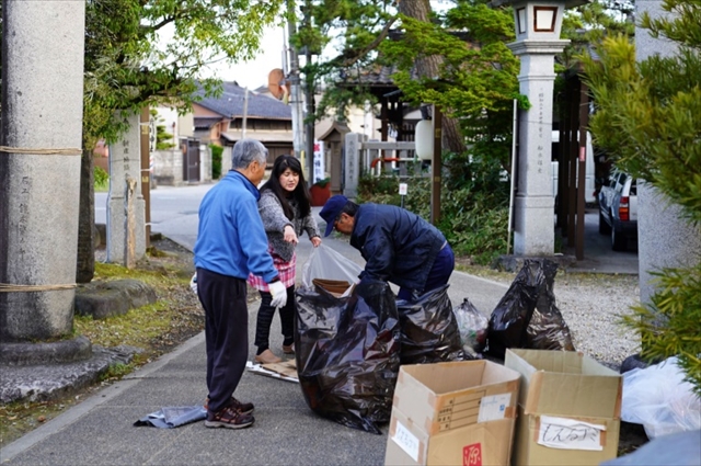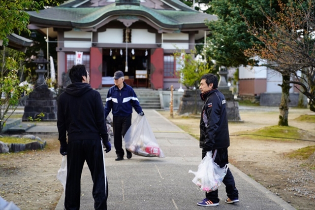新庄町の神社をお世話する人たち、若鷹会の人たちは前日(ぜんじつ)のみこし渡御(とぎょ)でつかれているにもかかわらず、朝、はやおきをして仕事に行く前に境内のゴミひろいをしていただいています。