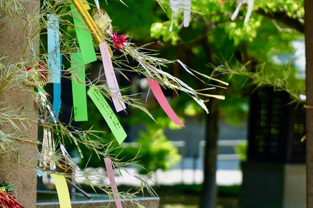境内の手水舎に竹をたててみなさんにおもいおもいのおねがいごとを込めて短冊(たんざく)にかいてもらっています。